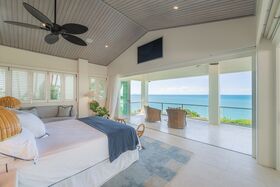 The ground level features a luxurious master suite with a king-size adjustable/reclining bed, panoramic ocean views, a walk-in robe, and a private ensuite, along with two additional king bedrooms, each with its own ensuite—ideal for families or groups.