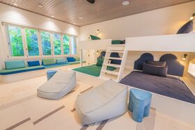 On the first level is another king bedroom with ensuite and a versatile retreat room with a king-size fold-down bed and private ensuite, which can also serve as a sitting or lounge area. Opposite this wing, the bunk room includes two queen beds with two king-single bunks above, plus its own ensuite—perfect for children or teens.