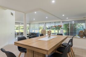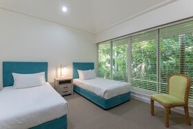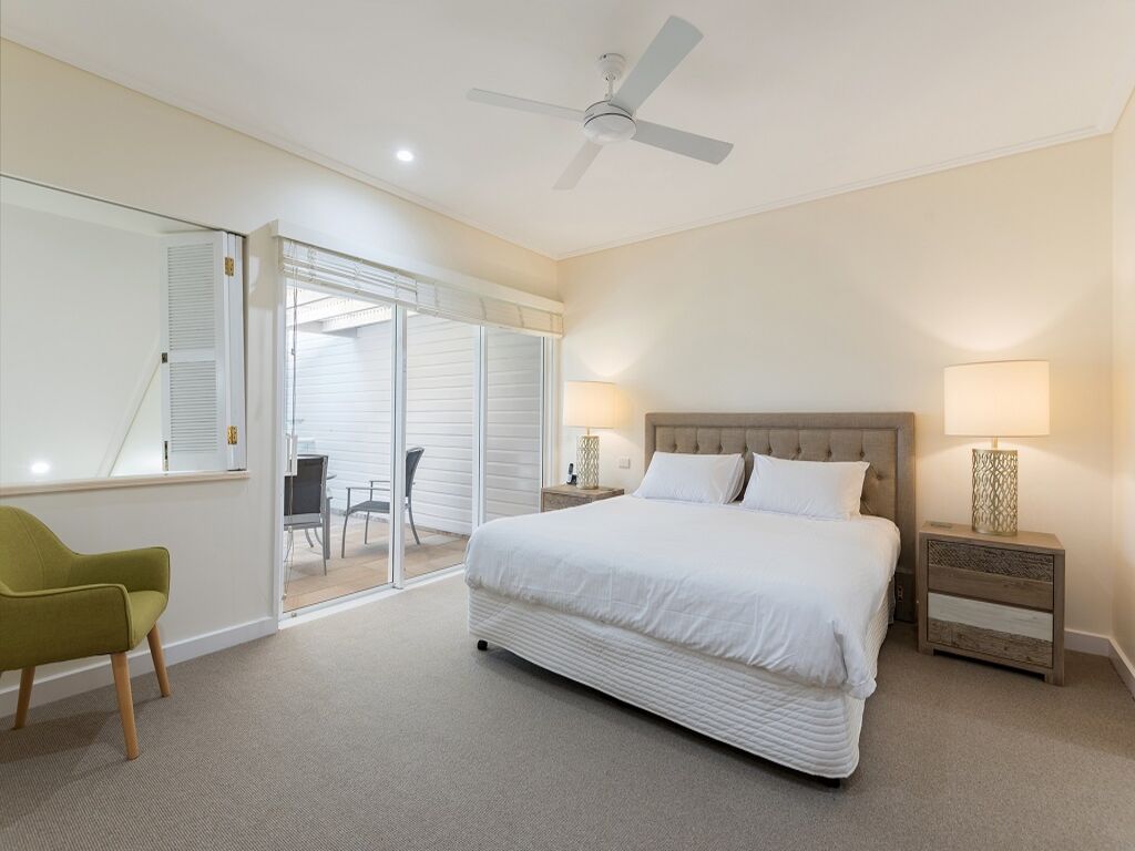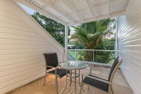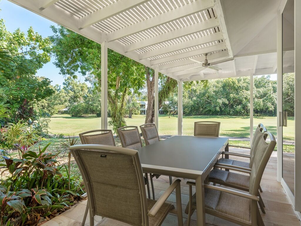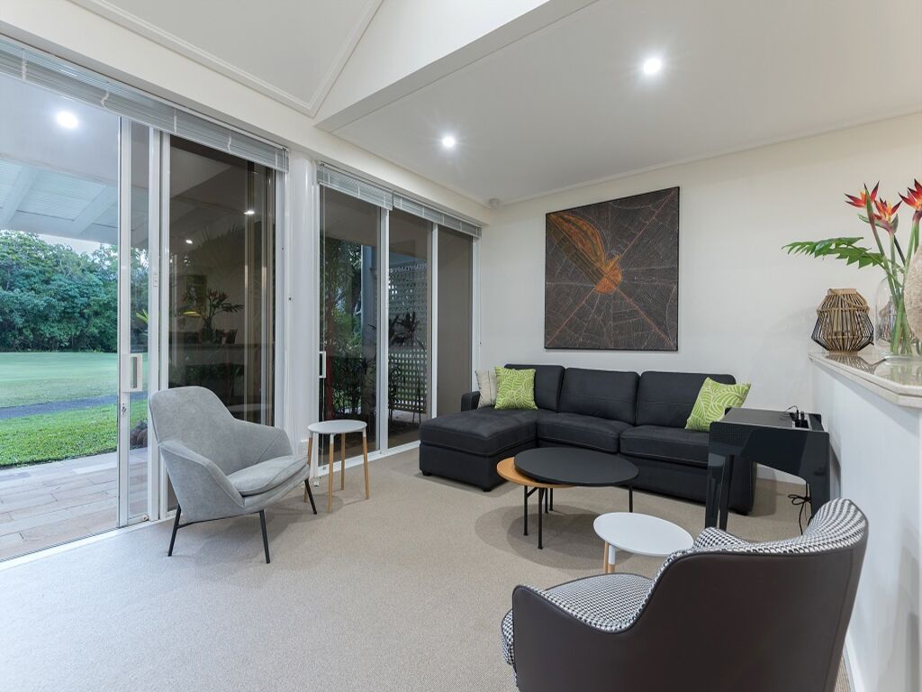Accessed via a timber boardwalk from your private undercover carport, the villa is surrounded by lush tropical gardens and overlooks the scenic 4th fairway—an idyllic backdrop for a relaxing getaway.
